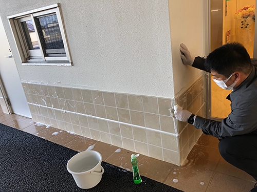車の往来も多く白くて新しい建物が汚れやすいので清掃を行いました。