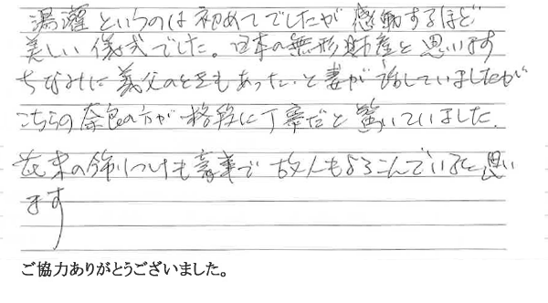湯灌というのは初めてでしたが感動するほど美しい儀式でした。日本の無形財産と思います。