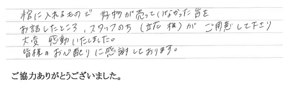 棺に入れるもので好物が売っていなかった旨をお話ししたところ、スタッフの方(立花様)がご用意して下さり、大変感動いたしました。