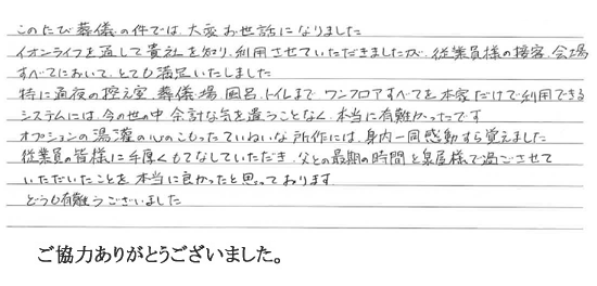 特に通夜の控え室、葬儀場、風呂、トイレまで、ワンフロア全てを本家だけで利用できるシステムには、今の世の中余計な気を遣うことなく、本当に有難かったです。