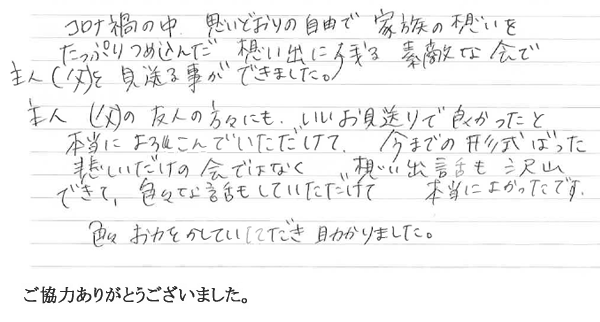 コロナ禍の中、思い通りの自由で家族の想いをたっぷりつめ込んだ思い出に残る素敵な会で主人(父)を見送ることができました。