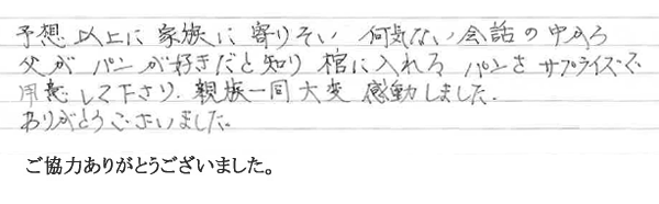 想像以上に家族に寄り添い、何気ない会話の中から父がパンが好きだと知り、棺に入れるパンをサプライズで用意して下さり、親族一同大変感動しました。